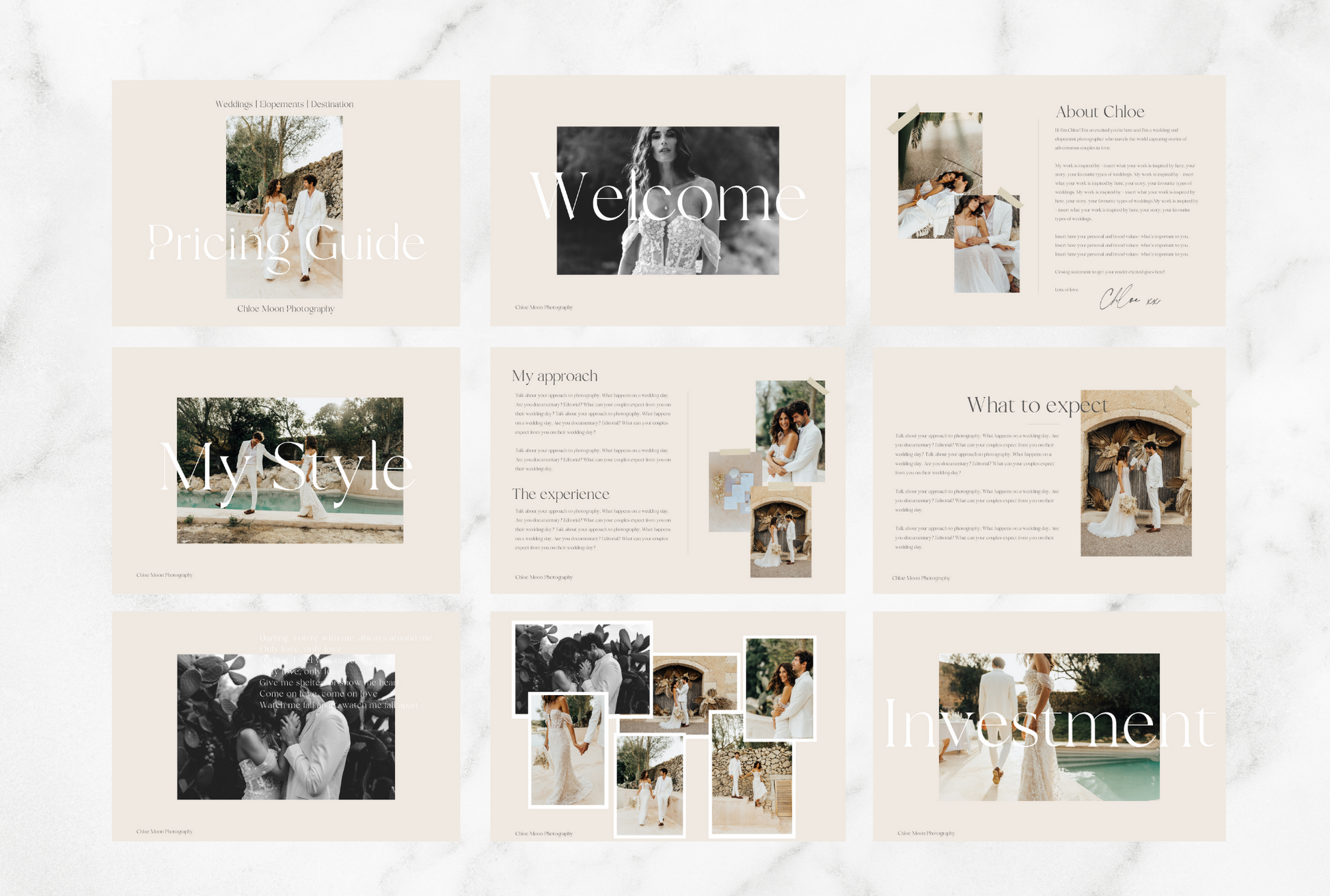 These beautifully designed pages will set you apart from other photographers and add real value to your business. They’re fully editable, and have engaging copy for every page (except the ‘About Me’ section, frequently asked questions and your prices). So all you have to do is personalise the information and drag and drop your photos. Then fall in love with your shiny new pricing guide.