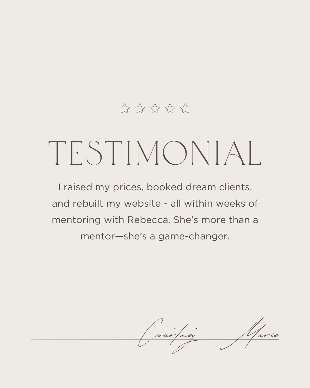 Today, I bring that unique blend of skills - plus years of building my own successful wedding photography business - into these mentoring sessions. I’m known for my honest, practical approach: no jargon, no gatekeeping, just actionable advice that works.