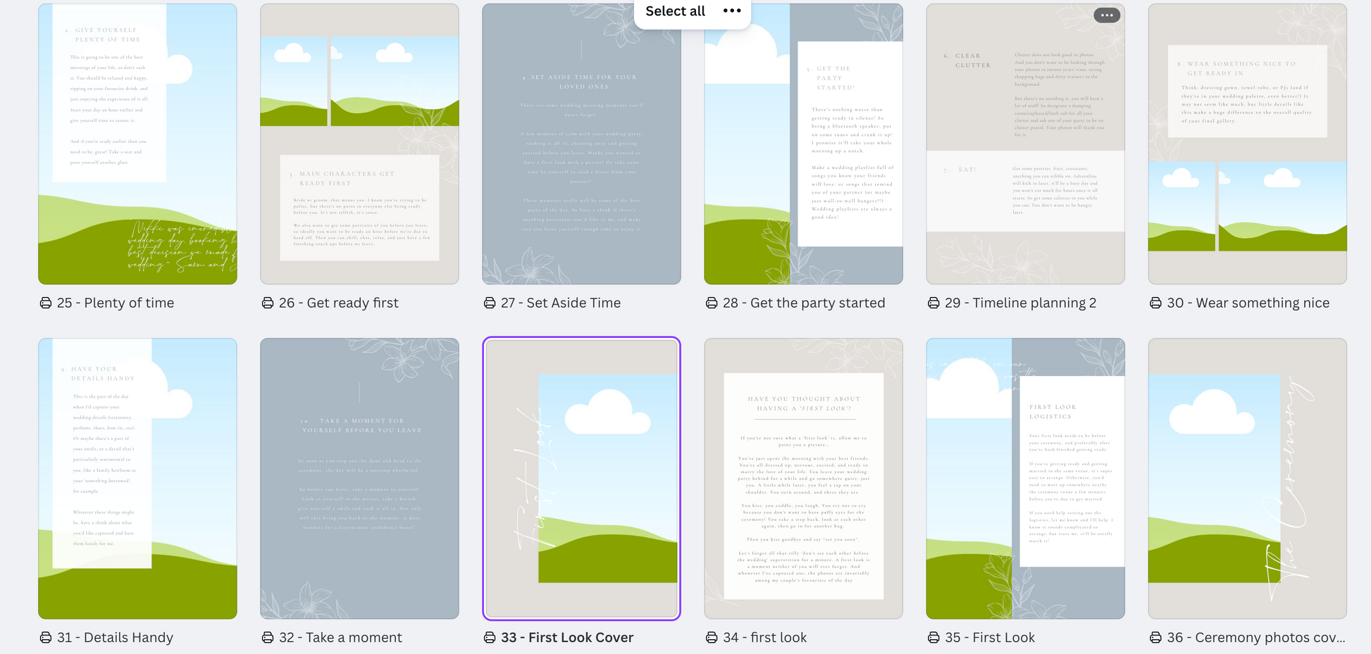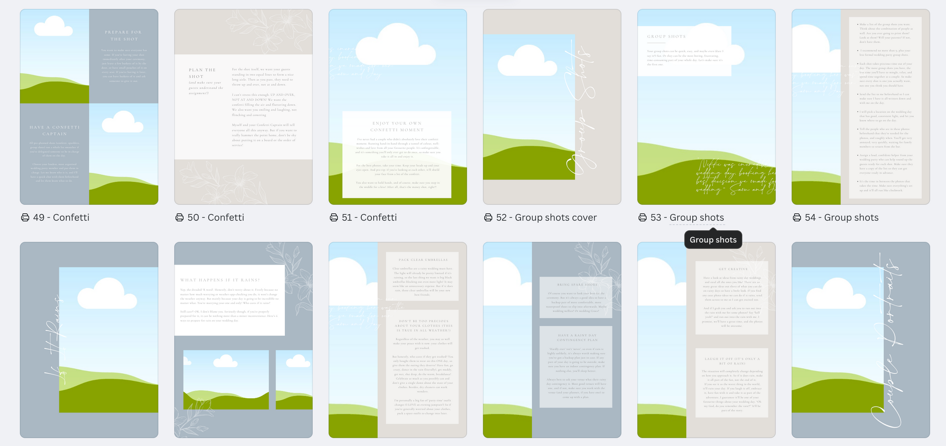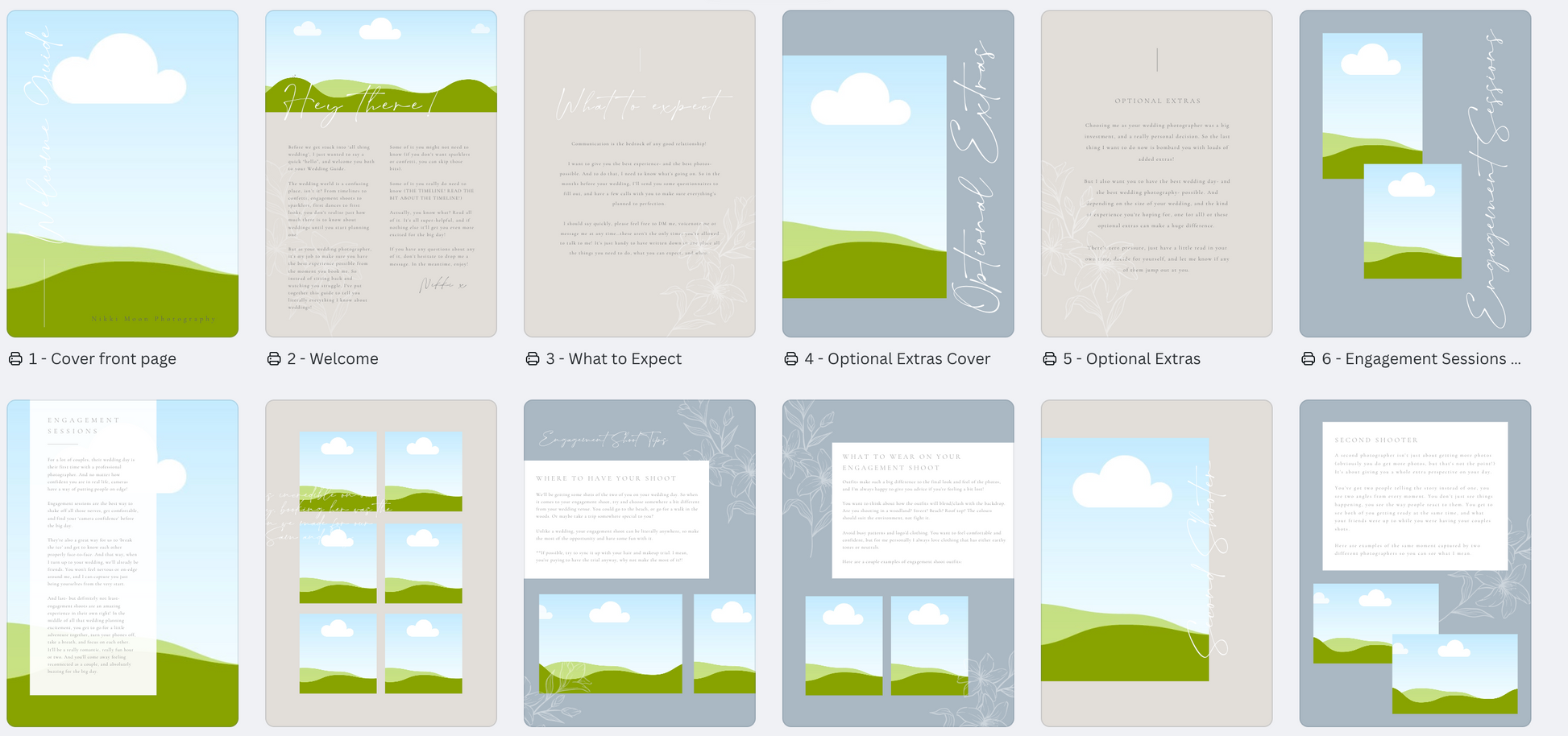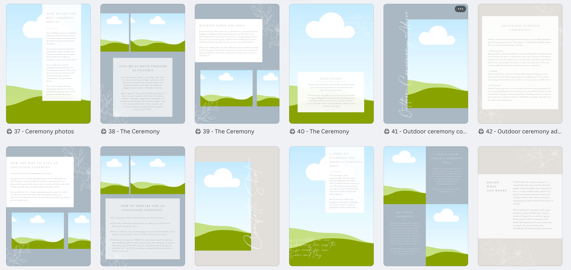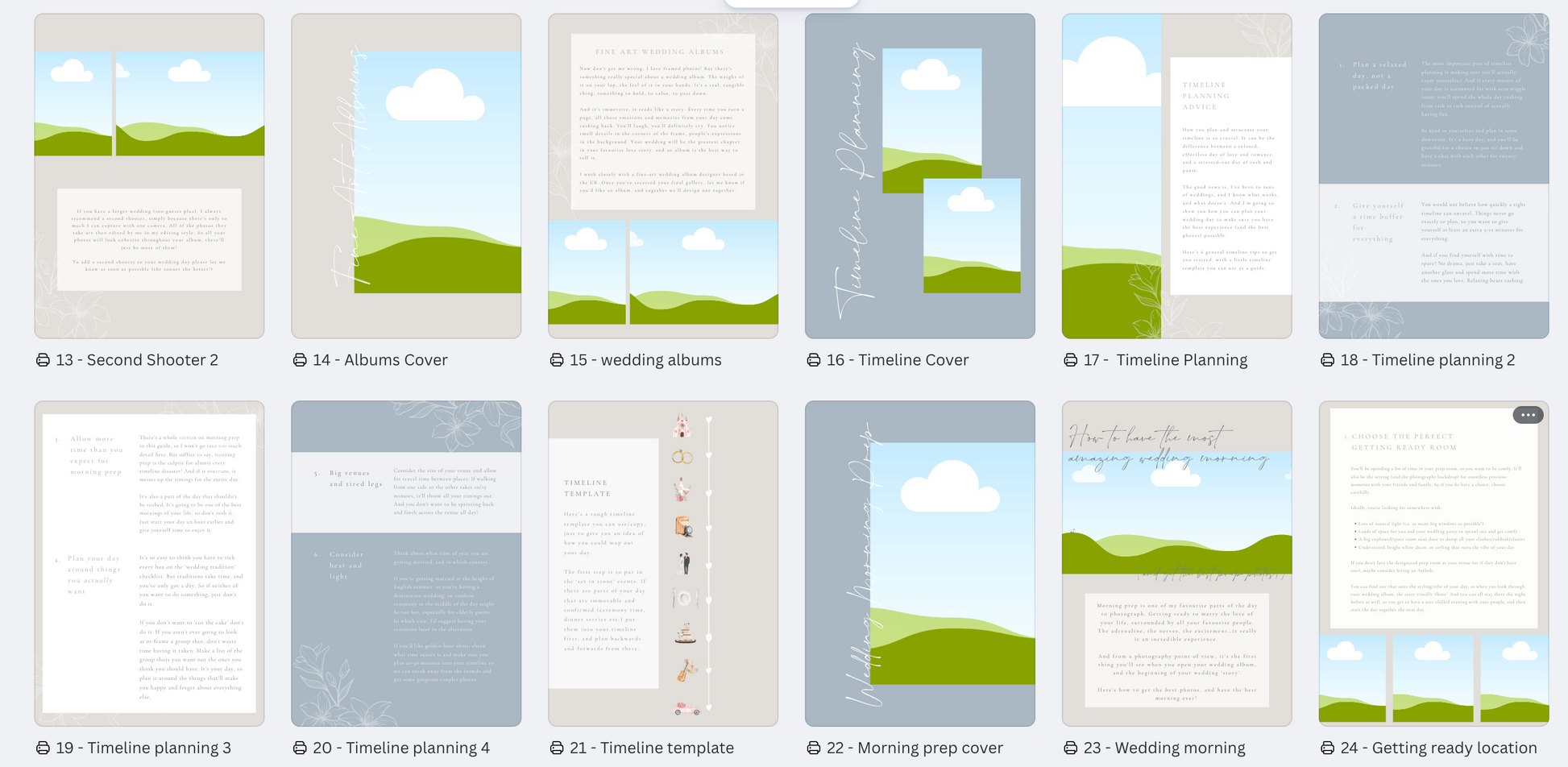 Cover Page ✨Welcome Intro page ✨What to Expect ✨ Engagement Section including Why Have an Engagement Shoot, Examples, Engagement Shoot Quick Tips and What to Wear pages ✨Second Shooter Section including Why Have a Second Photographer and examples ✨ Wedding Albums ✨ Timeline Planning Advice ✨Timeline Example Template ✨Getting Read location tips ✨Guide to Morning Prep ✨ First Look ✨How to get the best Ceremony Photos ✨Advice for Outdoor Ceremonies ✨Unplugged Ceremonies ✨Planning the Perfect Confetti Shot ✨What Happens If It Rains? ✨ Couple Portraits ✨Golden Hour ✨Sparkler Shots ✨Group Photos ✨First Dance and Dance floor Tips ✨I’ve Got My Wedding Gallery - Now What?